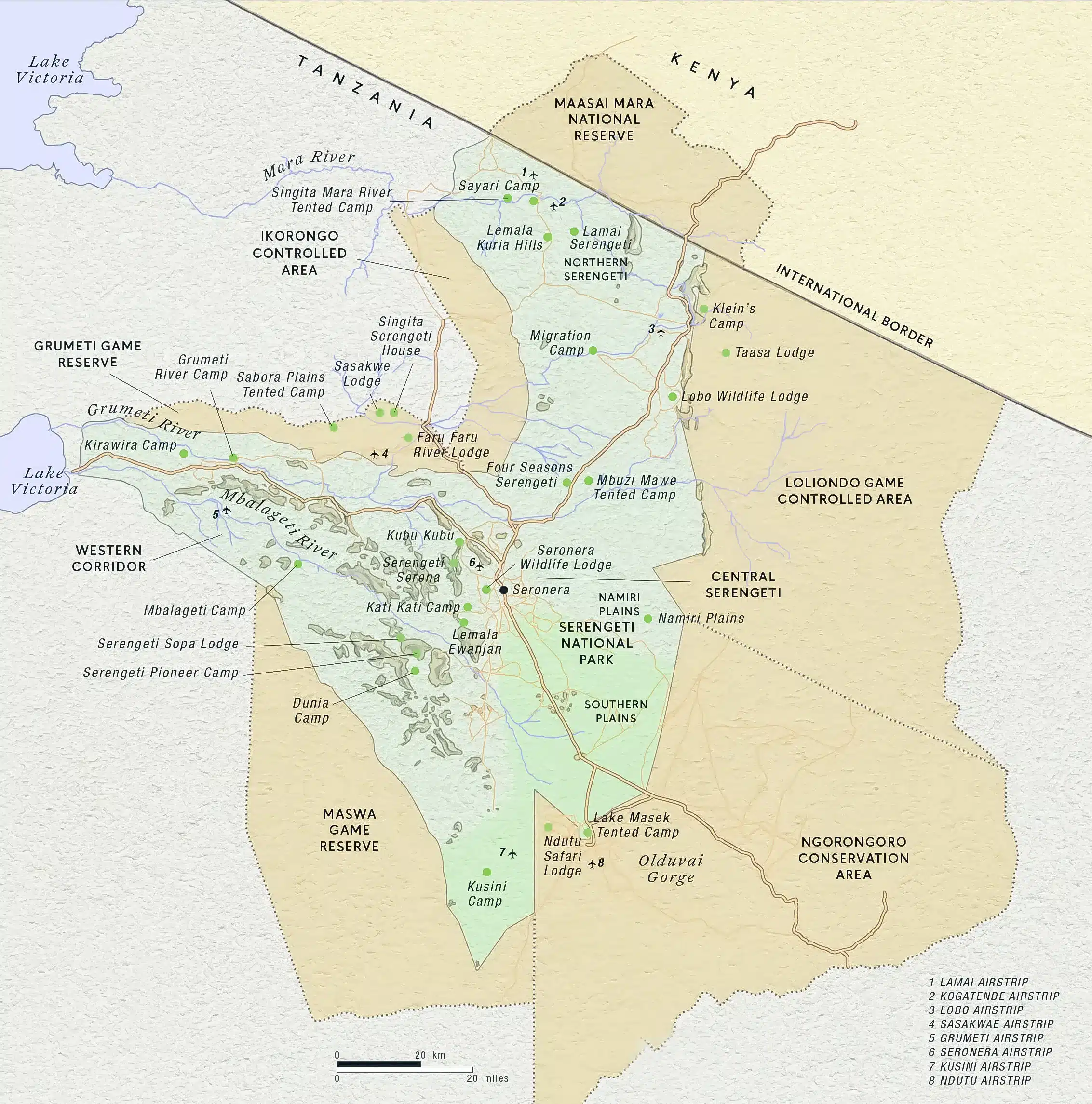 Below is a detailed map of the Serengeti National Park showing all the locations, some attractions and accommodation properties found in the Serengeti.